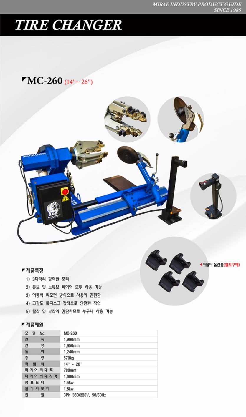 10년 이상 누적 판매 실적 / 안정적인 부품 공급 체계 확보 14~26인치 대응. 타이어 385까지 가능 / 3마력 전동식 모터 장착으로 강력한 성능 구현