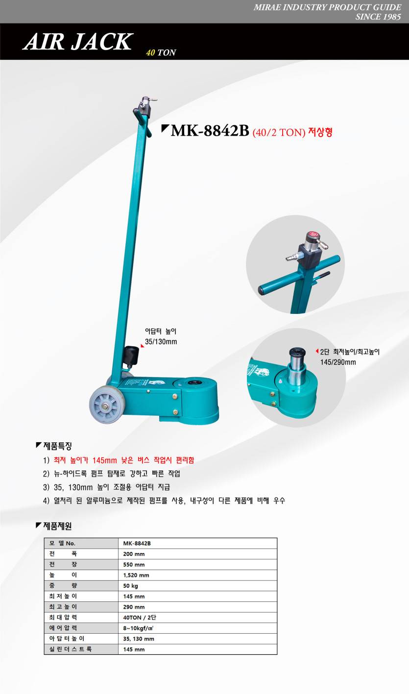 최저 높이 가장 낮음 / 국내 최초 개발 / 30년간 꾸준한 판매 실적 1단 : 40톤, 2단 : 18톤 / 최저 높이 : 145mm / 추천 차량 : 전기버스, 저상버스