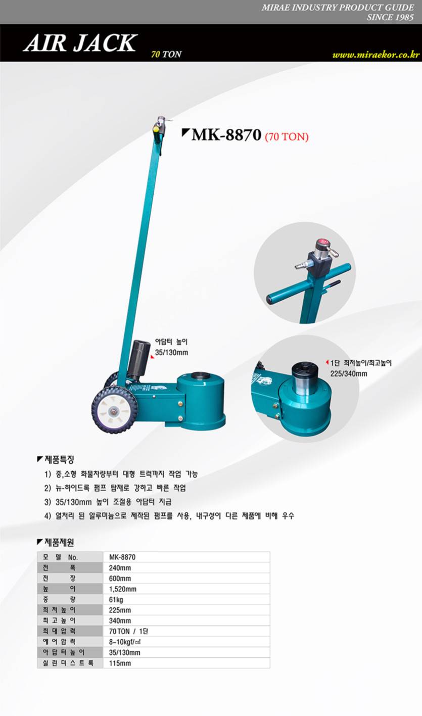 국내 최초 개발 / 30년간 꾸준한 판매 실적 1단 : 70톤 / 최저 높이 : 225mm / 추천 차량 : 특수차량
