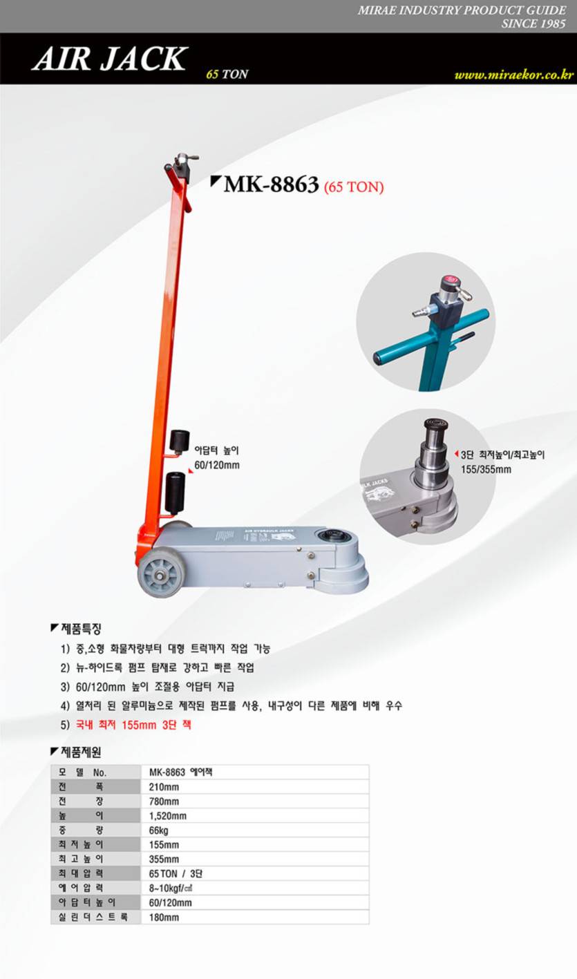 국내 최초 개발 / 30년간 꾸준한 판매 실적 1단 : 65톤, 2단 : 35톤, 3단 : 18톤 / 최저 높이 : 155mm / 추천 차량 : 덤프트럭, 5톤 트럭, 대형버스