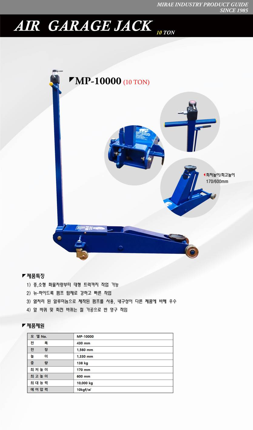 최대 능력 10톤 / 최저 높이 : 170mm / 최고 높이 : 600mm