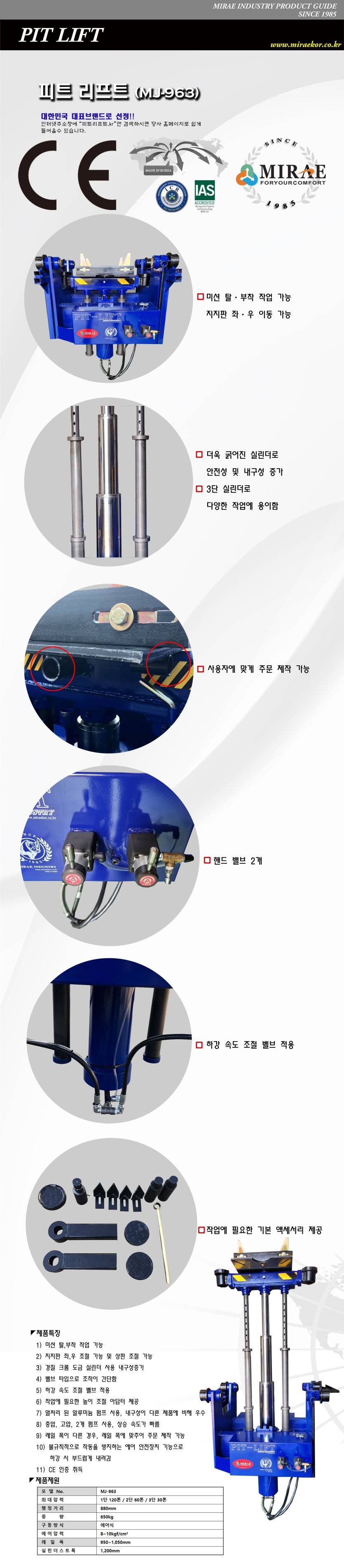 1단 : 120톤 / 2단 : 60톤 / 3단 : 30톤 오랜 기간 꾸준히 채택된 신뢰의 정비 장비 / 대한민국 대표 브랜드로 선정 / CE인증 레일 간격, 최저/고 높이 등 고객 요청에 따라 맞춤 제작 가능
