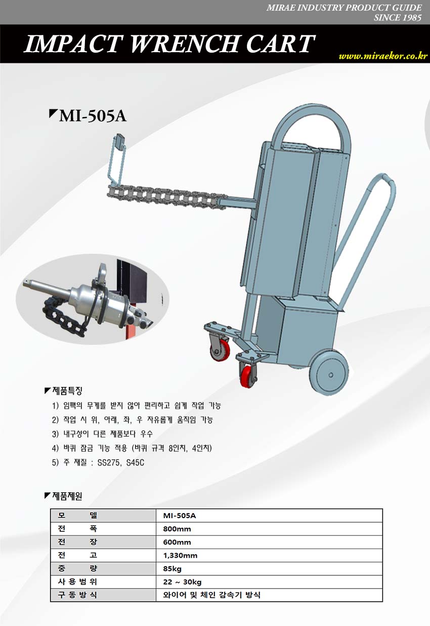 임팩의 무게를 받지 않아 편리하고 쉽게 작업 가능 작업 시 위, 아래, 좌, 우 자유롭게 움직임 가능 바퀴 잠금 기능 적용 (바퀴 규격 8인치, 4인치) 주 재질 : SS275, S45C